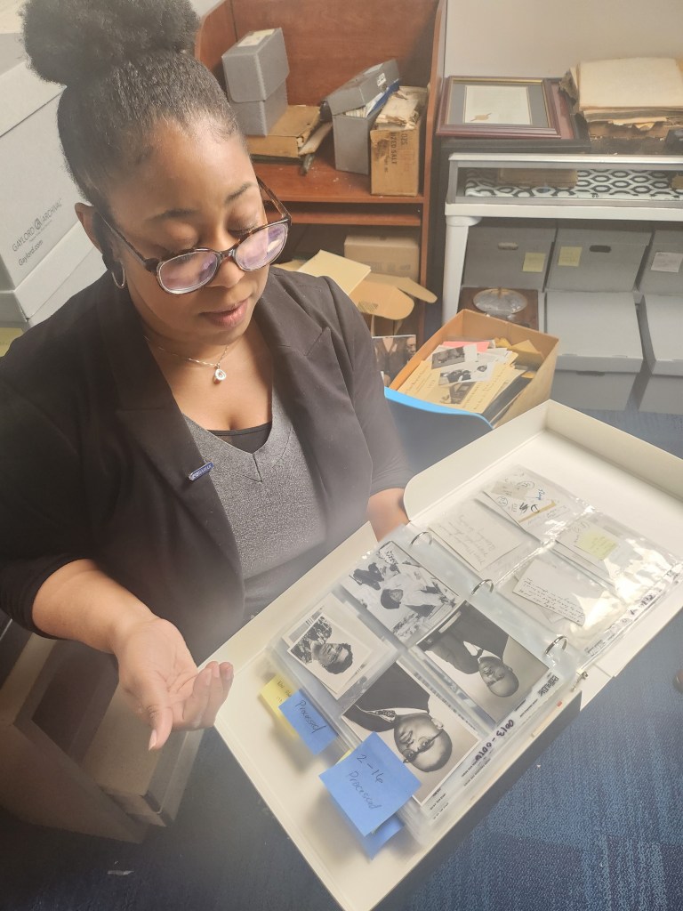 A picture of Angel Pridgen looking through archival material at American Baptist University. Photo courtesy of the HBCU Digital Library Trust.
